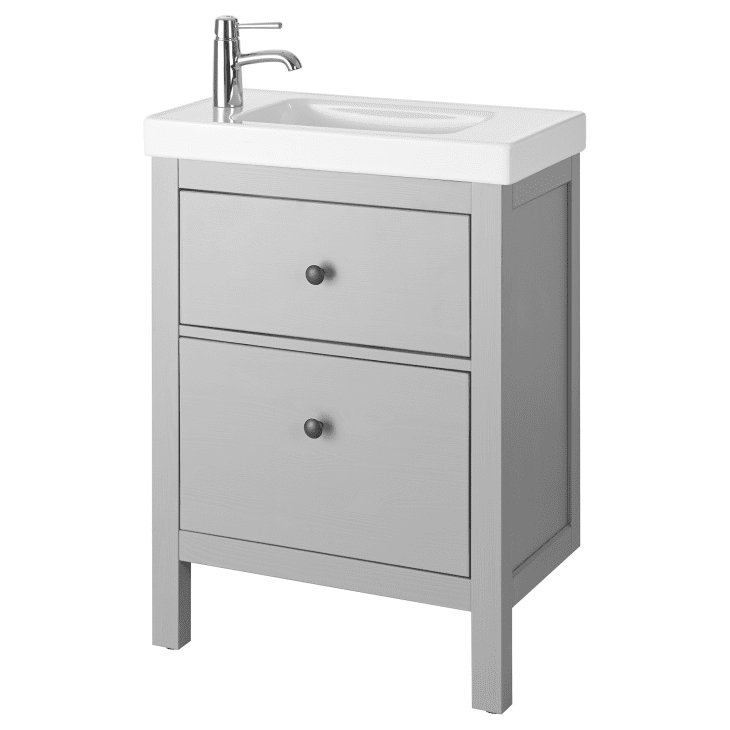 H bath vanity in grey with vanity top in white with white basin and mirror.